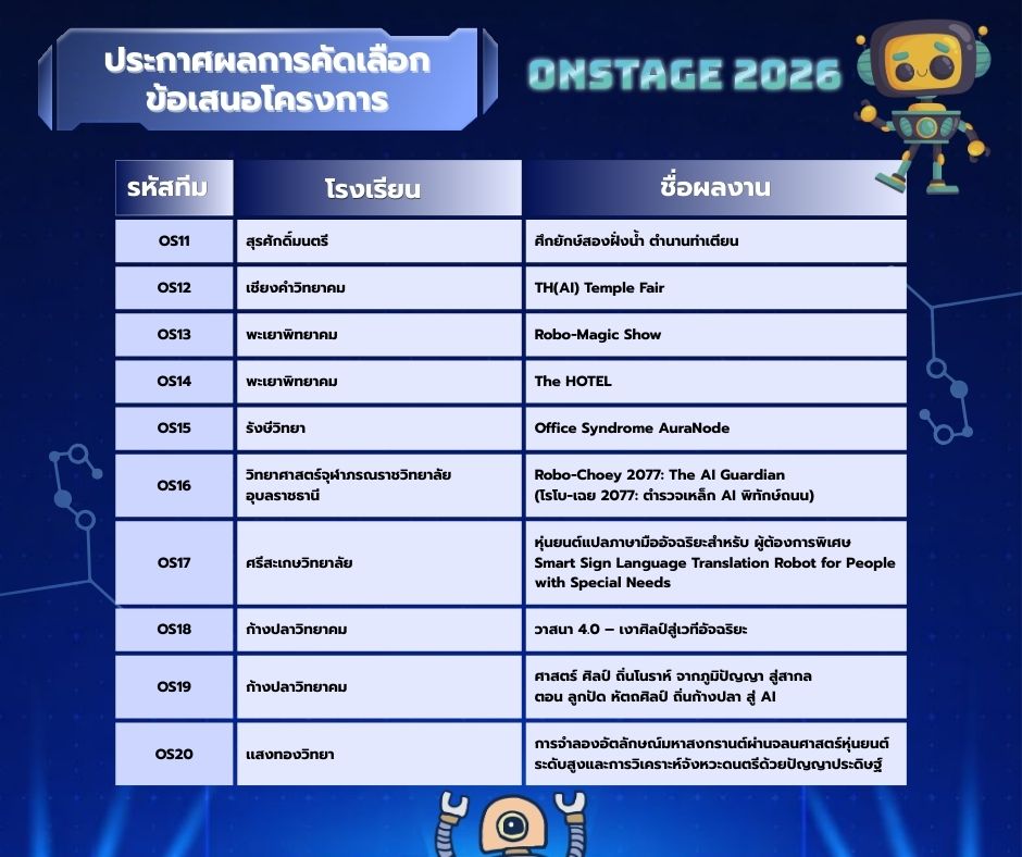 - ทีมแข่งขันรอบสุดท้าย 10 ทีม จำได้รับสนับสนุนค่าที่พักและค่าอาหาร สำหรับการเข้าแข่งขัน OnStage 2026 ณ จังหวัดปทุมธานี และ กรุงเทพมหานคร